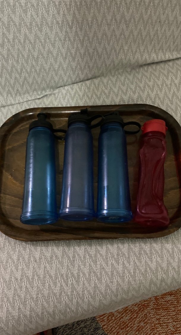 Kilitli kapaklı koyu mavi suluk seti. Farklı tasarımlı kırmızı da dahil.