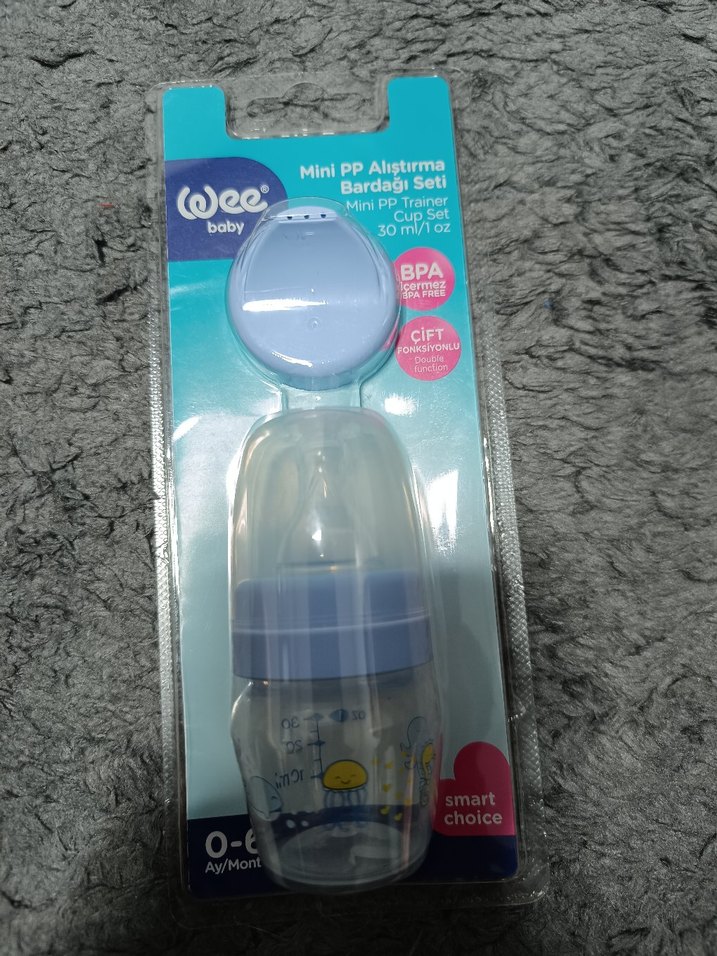 Pastel mavi renkli, 0-6 ay bebekler için uygun kapaklı ve yumuşak emzikli biberon. Ambalajda 'smart choice' yazısı bulunur.