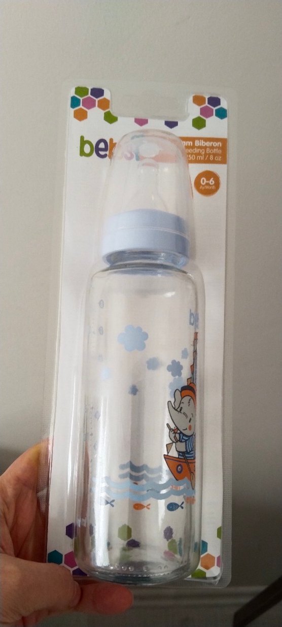 Pastel mavi renkte, 250 ml kapasiteli, fil desenli bebek biberonu. 0-6 ay arası bebekler için uygundur. hiç kullanılmadı
