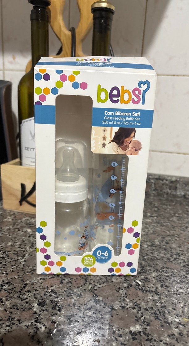 Pastel mavi renkte, yumuşak emziği ve sevimli tekne desenli şeffaf bebek biberonu, "bebsi" marka hiç kullanılmadı