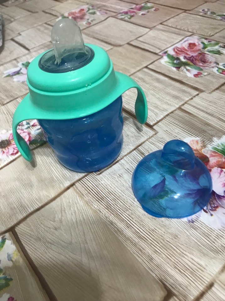 Kolay tutuş için kulplu, yumuşak emzikli mavi bebek biberonu. Renkli kapak ile birlikte.