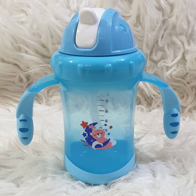 Kulplu ve ölçü işaretli mavi bebek biberonu, renkli tasarıma sahip, güvenli kapaklı.Samanla %100 BPA içermez Açık ve kapalı tasarım Sızıntıya dayanıklı 200 ml/6 oz 6 ay+