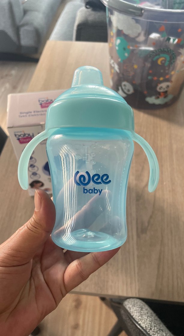 Pastel mavi renkte, kulplu bebek biberonu. Üzerinde 'Oee baby' yazısı bulunur. Kolay tutuş sağlar.
