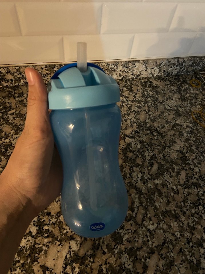 Mavi tonlu mavi kapaklı, pipetli mavi bebek biberonu. Rahat tutuş için kavisli tasarıma sahiptir.