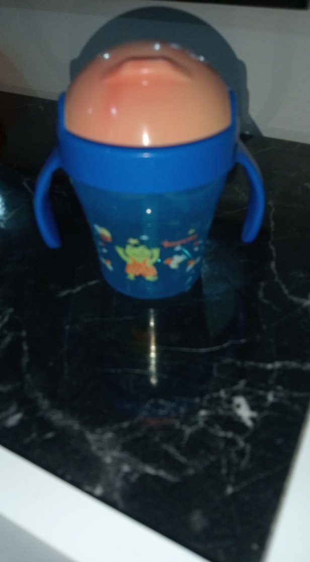 Saplı mavi bebek biberonu, üzerinde renkli desenler ve yumuşak pembe kapak bulunur.