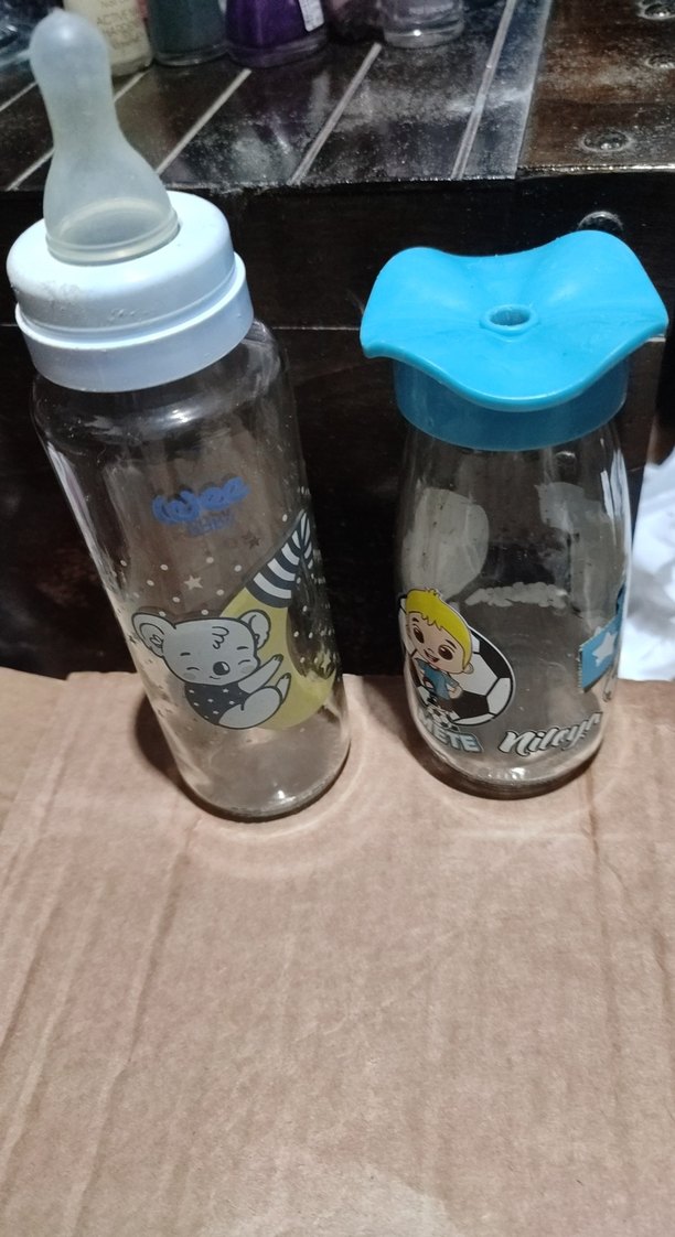 Renkli tasarımlı, mavi kapaklı iki bebek biberonu seti. Biri koala, diğeri futbol oynayan çocuk figürlü.
