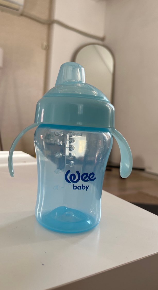 Pastel mavi renkte, tutacaklı bebek biberonu. Yumuşak emzik ve 'Wee baby' markalıdır. Sıfır ürün.hiç kullanılmadı. Markayı temsili