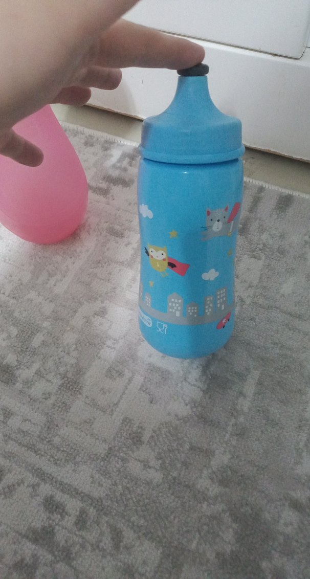 Pastel mavi, süper kahraman temalı hayvan desenli bebek biberonu. Tutması kolay tasarım içerir.