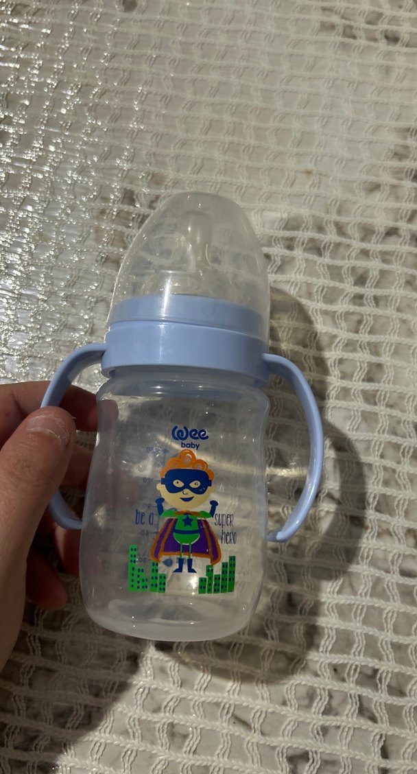 Mavi renkte, tutacaklı bebek biberonu. Yumuşak emzikli ve süper kahraman desenli.