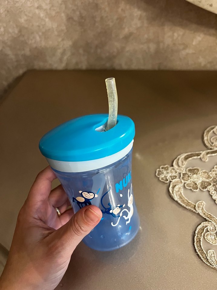 Canlı mavi renkte, pipetli ve hayvan desenli bebek biberonu. Kolay içim sağlar.