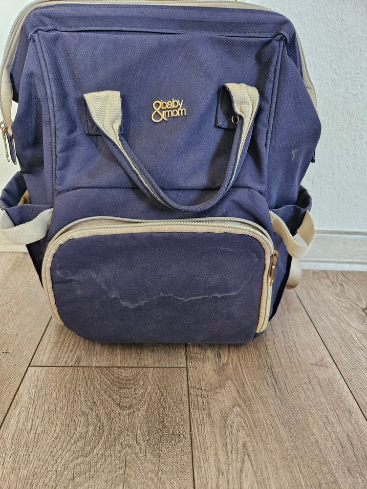 Mavi ve gri renklerde, baskılı detaylara sahip, bebek eşyalarını düzenlemek için çok bölmeli bebek çantası.
