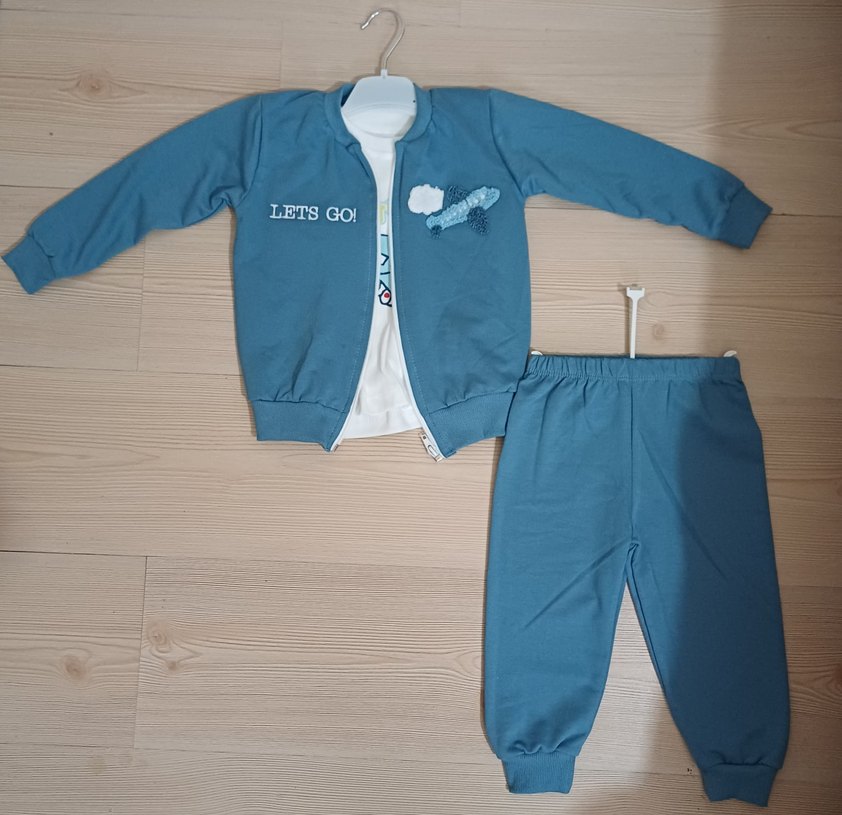 Yumuşak fleece kumaştan yapılmış, fermuarlı ve "LETS GO!" baskılı Uçak Nakışlı m avi bebek erkek 3' lü takım.