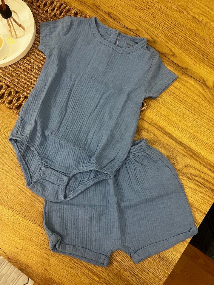 Mavi keten kumaştan, kısa kollu ve yuvarlak yakalı bebek erkek şortlu rahat takım. Bohem tarzda, zahmetsiz şıklık sunar.