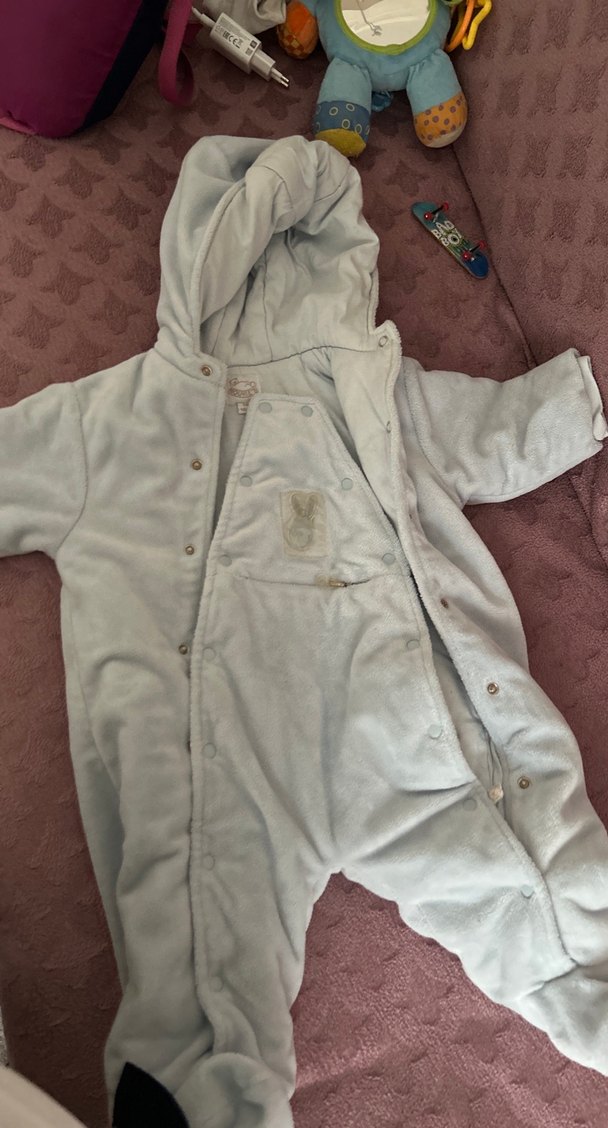 Mavi renkli, kapüşonlu, peluş kumaştan yapılmış bebek erkek tulumu. Kürk detaylarıyla sıcak ve rahat bir sokak stili sunar. ❄️