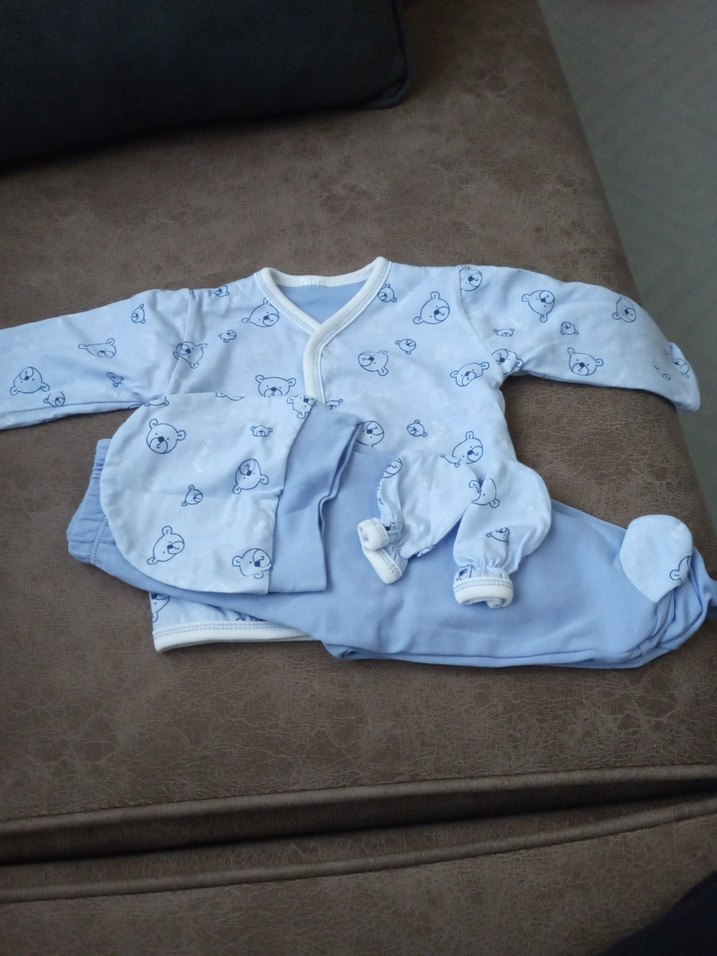 Yumuşak polar kumaştan, uzun kollu düğmeli ve yuvarlak yakalı üst, pastel mavi pantolon ve eldivenlerle tamamlanmıştır.