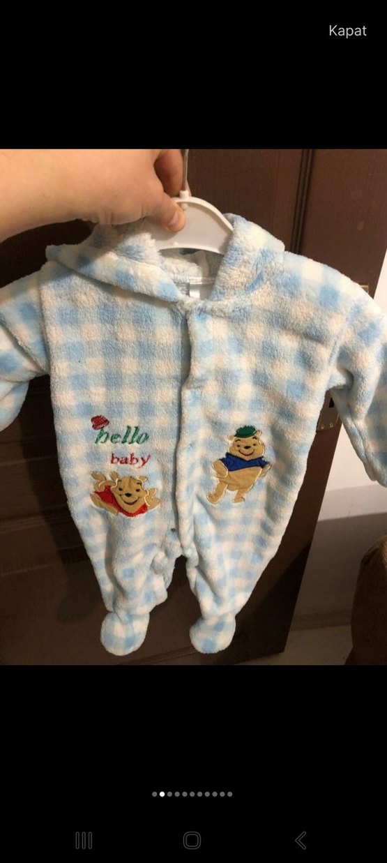 Mavi pastel renkli, yumuşak dokulu triko bebek tulumu, kapüşonlu ve eğlenceli desenlerle süslenmiş. Önünde 'baby' ve 'pello' yazısı bulunur ❄️.