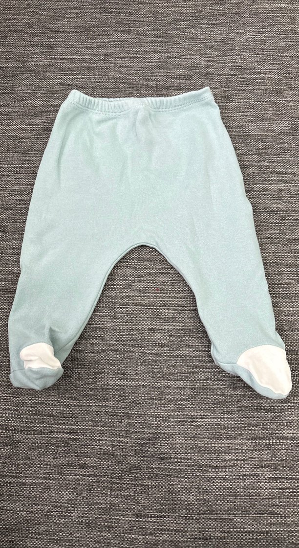 Yumuşak pastel mavi pamuklu bebek ayaklı pantolon, yeni doğanlar için rahat ve şık. Hastane kullanımı için uygundur.