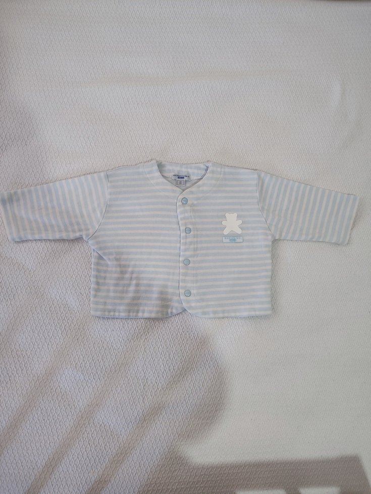 Uzun kollu, düğmeli gri bebek hastane kıyafeti, yumuşak ve sıcak kumaştan, ince çizgili desende.