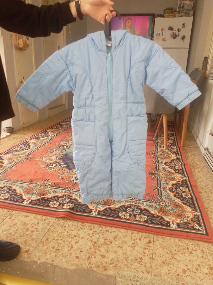 Pastel mavi renkte, yumuşak ve sıcak kumaştan yapılmış, fermuarlı ve kapüşonlu bebek kayak tulumu. Soğuk havalar için uygundur. ❄️