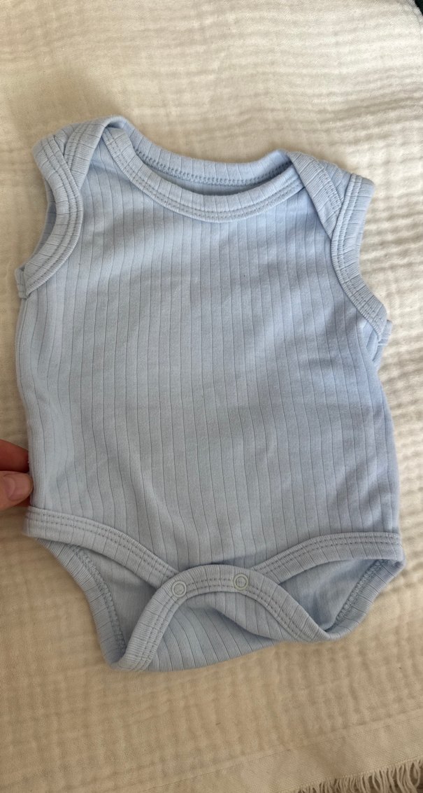 Pastel mavi renkte, kolsuz, yuvarlak yakalı ve çıtçıtlı bebek body, yumuşak sentetik kumaştan üretilmiştir.