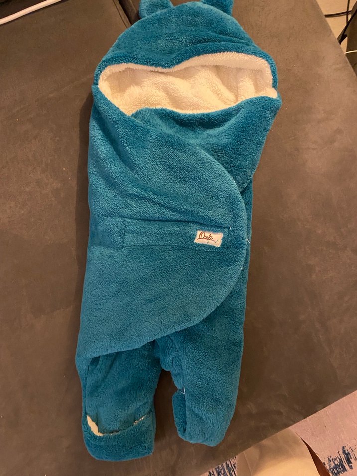 Kapüşonlu, sarmal tasarımlı yumuşak mavi bebek yarım kundak, içi beyaz sıcak astarlıdır. Çocukları rahat tutmak için uygundur.