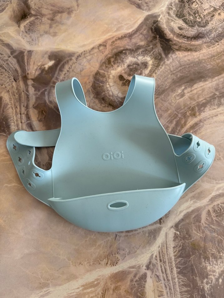 Yumuşak ve esnek malzemeden yapılmış, ayarlanabilir kayışlı ve dökülmeleri toplamak için geniş cep bulunan mavi bebek mama önlüğü. Temizlemesi kolay ve bebekler için rahat.