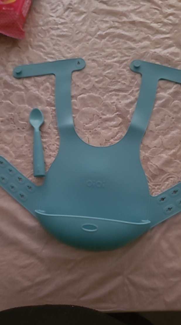 Ayarlanabilir askılı, esnek tasarımlı mavi bebek mama önlüğü ve döküntüleri yakalayan cep içerir. Bir kaşık seti ile birlikte gelir.