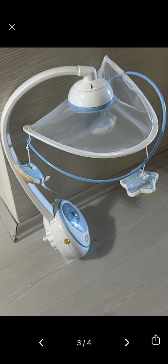 Açık mavi renkli, yıldız ve balık figürlü bebek müzikli döner oyuncak. Bebekleri eğlendirmek ve sakinleştirmek için melodiler çalar.