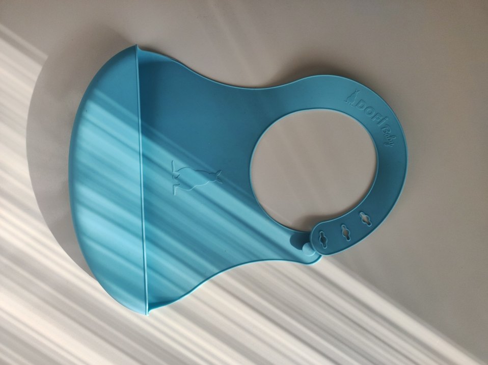 Mavi renkte, desensiz ve ayarlanabilir boyun askısına sahip bebek önlüğü. Yumuşak ve kolay temizlenebilir malzemeden üretilmiştir.