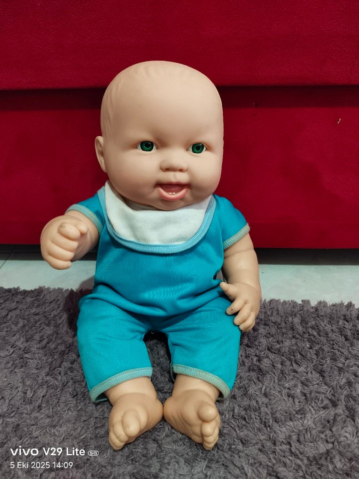 Fiyat sondur.. Sesli konuşan Mavi kıyafetli ve beyaz önlüklü renkli bebek oyuncak, gerçekçi yüz ifadesi ve yumuşak vücuda sahip.