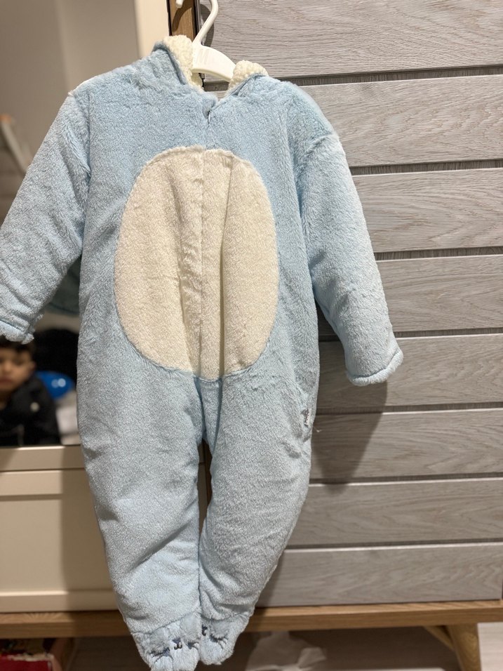 Pastel mavi renkte, kapüşonlu ve kürk detaylı yumuşak ve sıcak bebek tulumu. Hediye geldi hiç giyilmedi