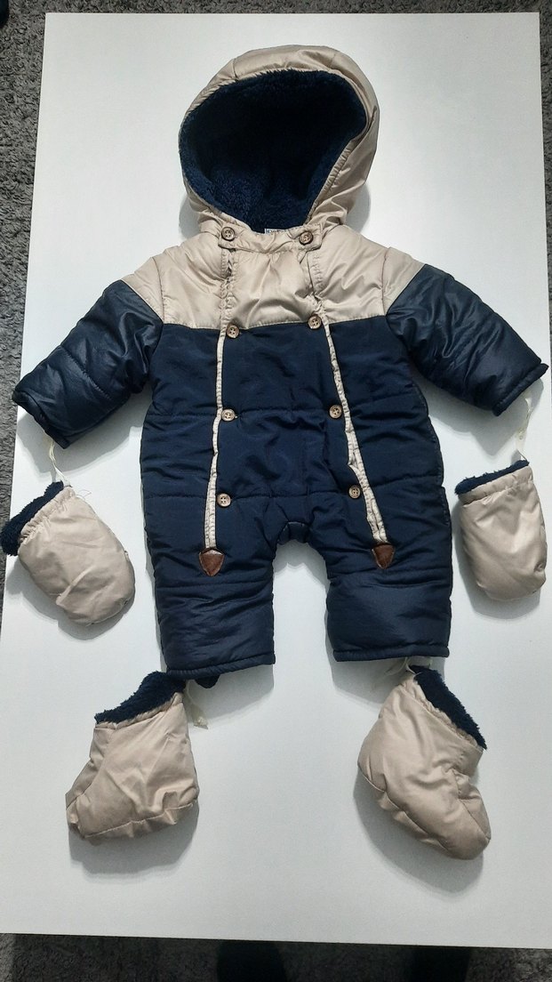 Koyu mavi bebek tulumu, içi yumuşak polar, düğmeli ön kapama ve uyumlu eldiven ile botlar içerir. Soğuk havalar için uygun. ❄️