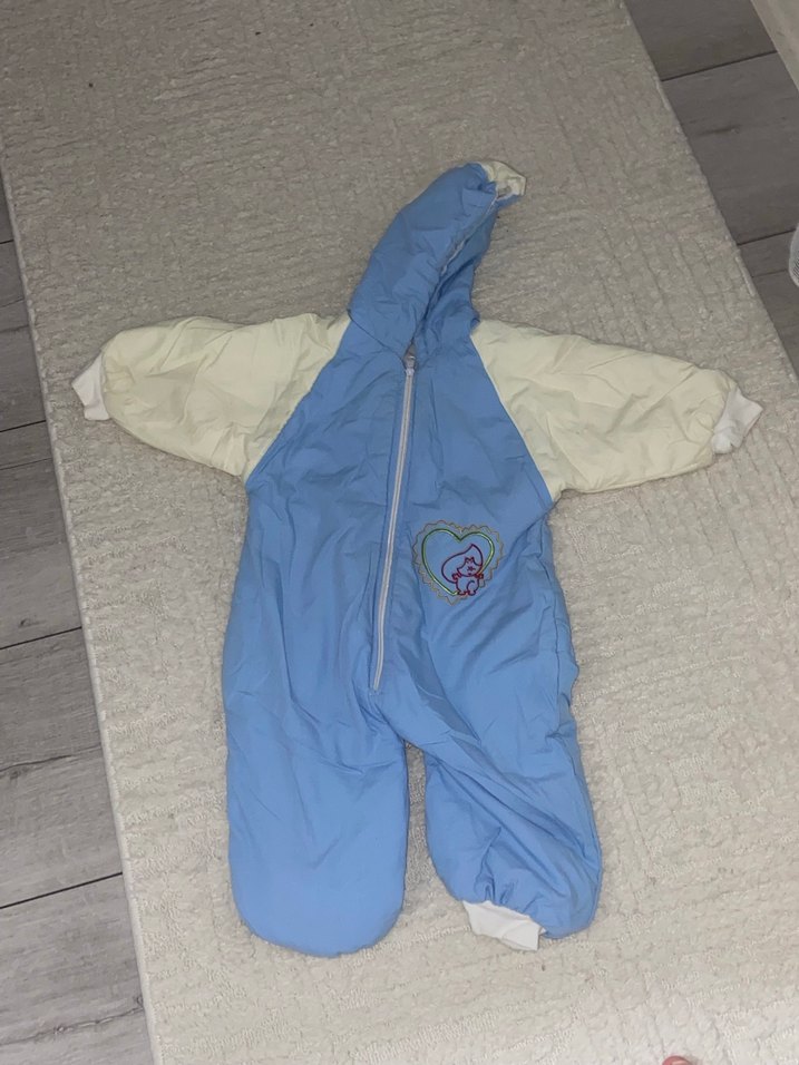Pastel mavi renkli, kapüşonlu ve ön fermuarlı, yumuşak ve sıcak kumaştan yapılmış bebek tulumu. Krem renk kollu ve göğsünde küçük kalp deseni bulunur.