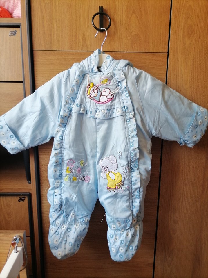 Pastel mavi renkte, düğmeli ve nakışlı desenlere sahip yumuşak polar kumaştan yapılmış bebek tulumu. Kapüşonludur ve sıcak tutar.