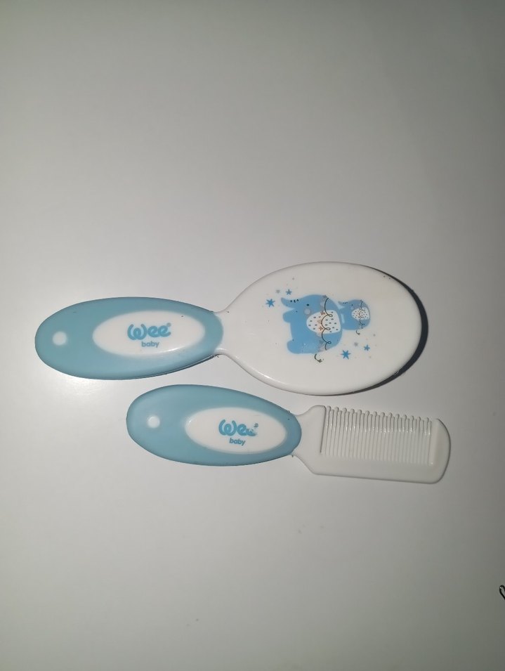 Yumuşak kıllı fırça ve ince dişli taraktan oluşan, mavi ayıcık desenli, rahat tutuşlu bebek saç bakım seti.