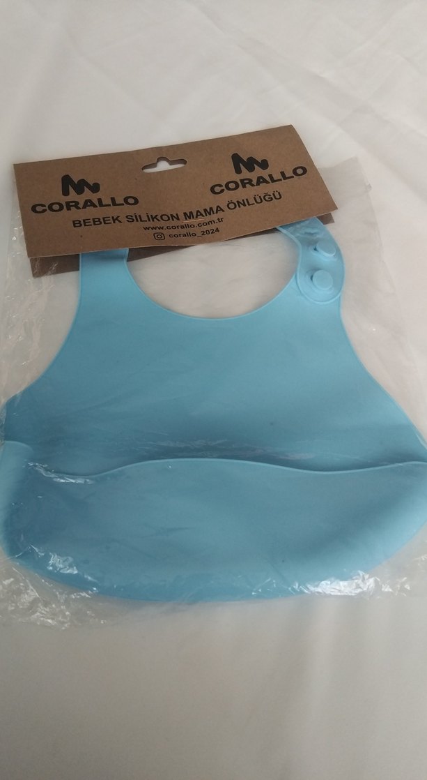 Pastel mavi renkli, baskılı Corallo marka silikon bebek mama önlüğü. Ayarlanabilir düğmelerle kolay temizlenir ve rahat kullanılır.