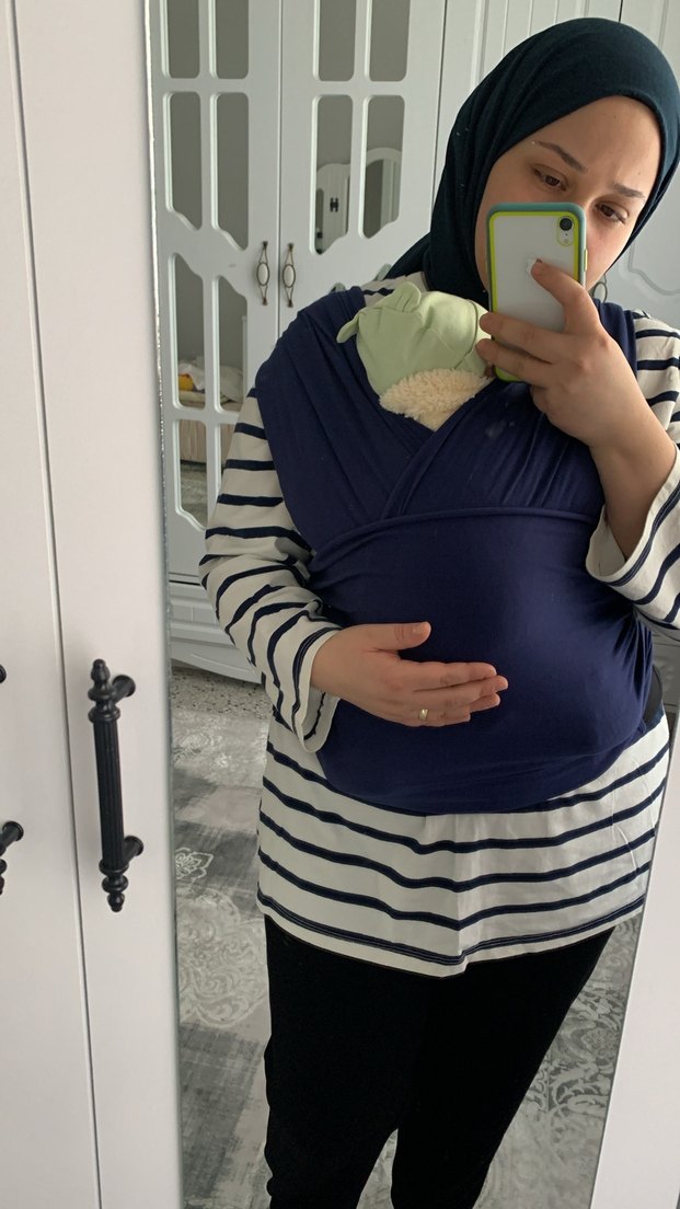 Yumuşak kumaştan mavi bebek slingi, bebeği güvenli taşıma ve kolay ayar imkanı sunar.