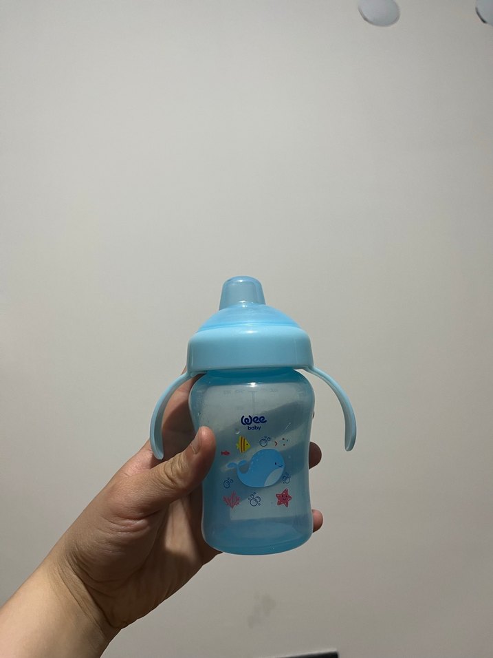 Pastel mavi renkte, kolay tutuşlu kulplara ve dökülmeyi önleyen kapaklı, deniz temalı sevimli baskılarla bebek biberonu . We baby orijinal marka Su akıtmaz