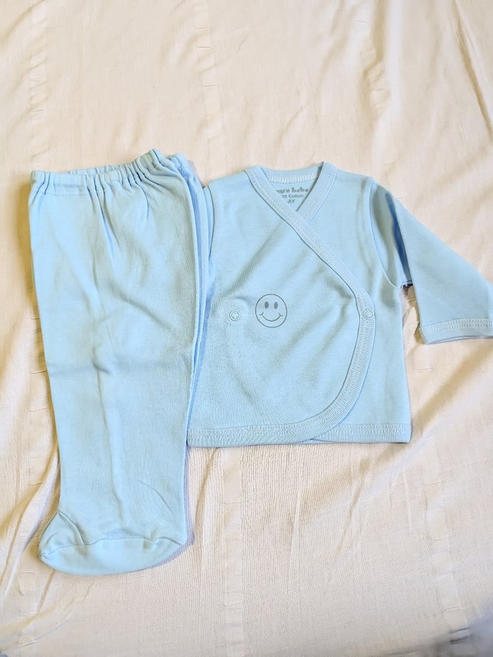 Yüzde yüz pamuktur. Sıfır hiç kullanılmamış Yumuşak ve sıcak kumaştan üretilmiş, uzun kollu ve yuvarlak yakalı mavi bebek takımı. Üstte gülümseyen yüz detayı ve rahat ayaklı pantolon bulunur.
