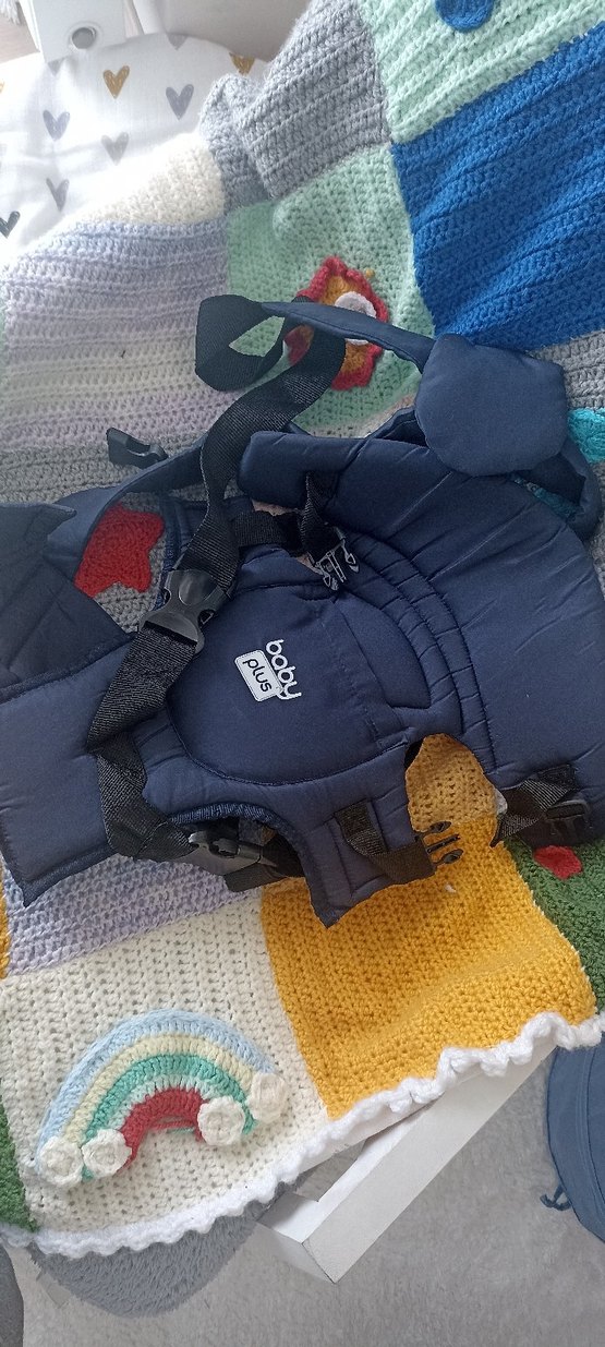 Ayarlanabilir askılara sahip koyu mavi Baby Plus bebek taşıyıcı, güvenli ve rahat taşıma sağlar. Bebek ve küçük çocuklar için uygundur. Sadece bir kere kullanıldı
