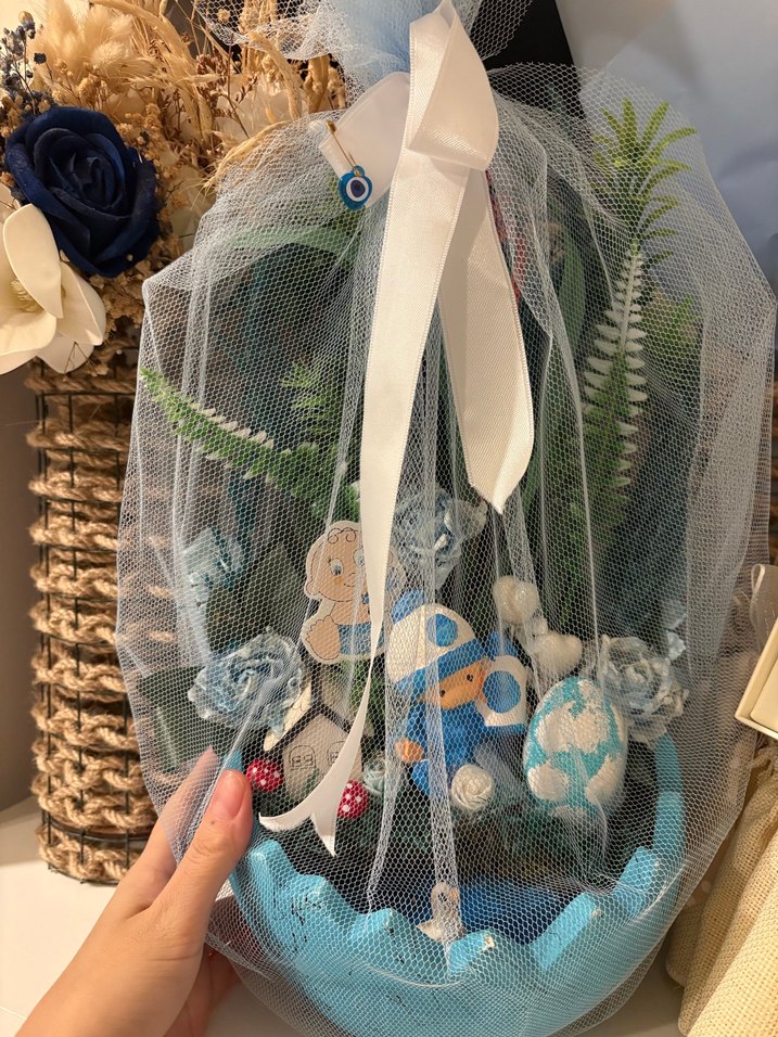 Beyaz tül ve fiyonkla sarılı, mavi bebek figürleri ve kumaş çiçekler içeren dekoratif süsleme .