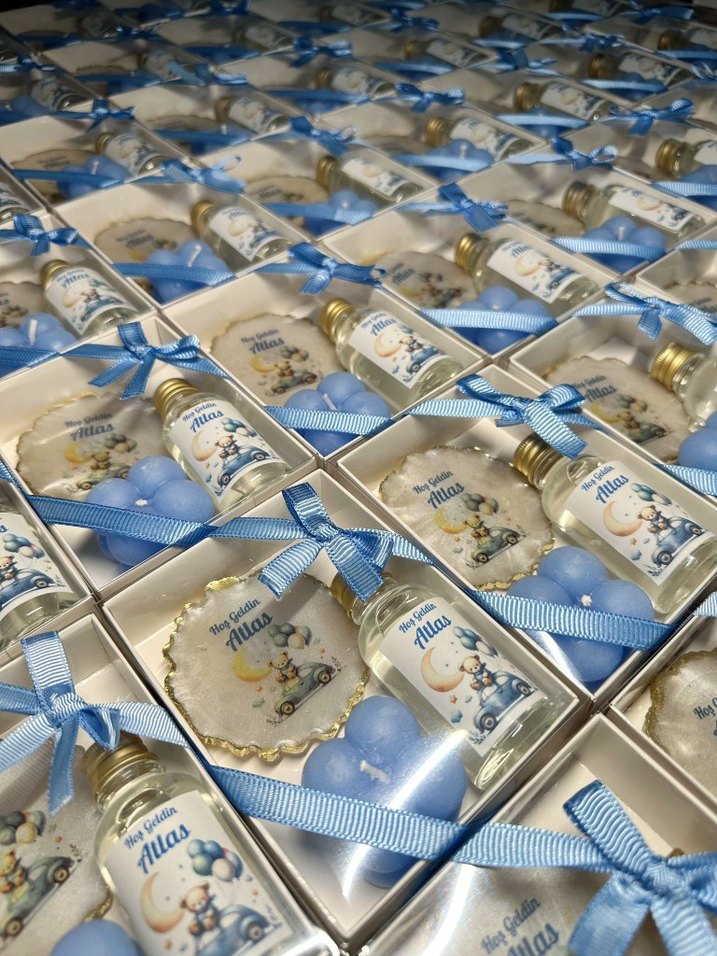 Küçük şişe, kişiye özel etiket ve mavi şekerlemelerden oluşan, mavi kurdele ile bağlanmış hediye seti. Özel günler için uygun.