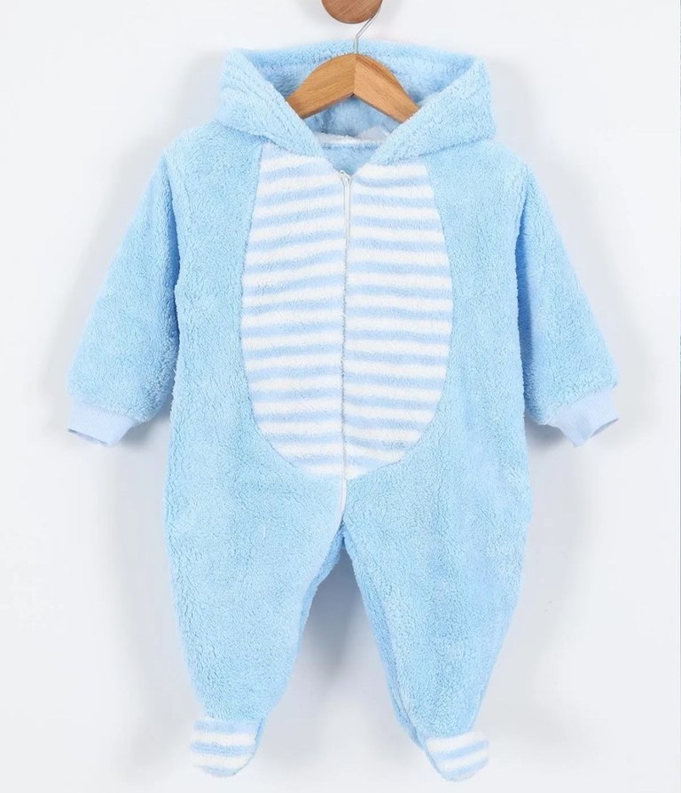 Pastel mavi kapüşonlu, zebra desenli bebek tulumu. Yumuşak ve sıcak kürk dokusu, kolay açılıp kapanan fermuar ile rahat kullanım sağlar. Mavi (6-9 Ay) Çizgili Patikli Welsoft Bebek Tulum. pmm308643