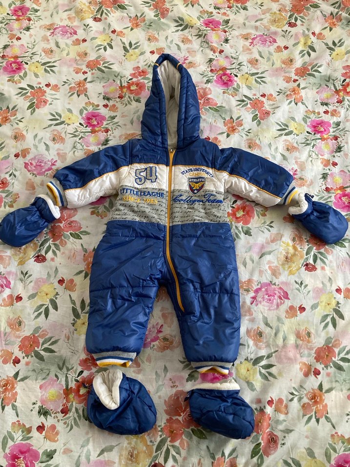Renkli mavi bebek kayak tulumu, fermuarlı ve nakışlı detaylara sahiptir. Yumuşak ve sıcak kumaştan yapılmış, kapüşonlu ve çıkarılabilir eldiven ile patik içerir.