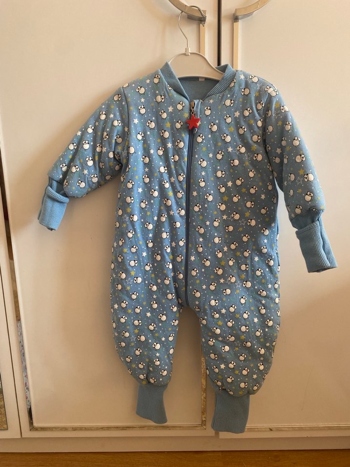 Mavi renkli, uzun kollu ve fermuarlı bebek tulumu. Yumuşak ve sıcak kumaş, küçük renkli desenlerle street wear tarzında. 9-12 ay