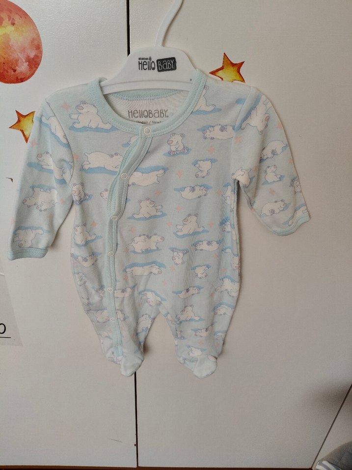 Pastel mavi renkte, uzun kollu ve düğmeli bebek tulumu. Yumuşak ve sıcak kumaştan üretilmiş, tişört yakalı ve desenli rahat bir tulum.