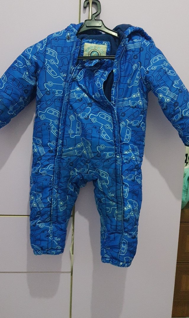 Renkli mavi bebek tulumu, yumuşak ve sıcak kumaştan üretilmiştir. Kolay giyilmesi için fermuarlı ön kısmı vardır ve sade araba desenli sokak stili sunar.