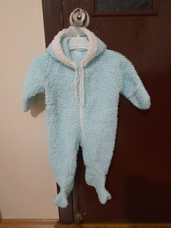 Pastel mavi renkte, kapüşonlu ve ayaklı örme dokulu bebek tulumu, bebeğinizi sıcak tutar. ❄️