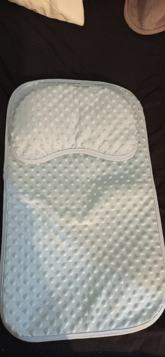 Yumuşak sentetik kumaştan yapılmış, dokulu yüzeye sahip mavi bebek uyku minderi ve yastığı seti. ️