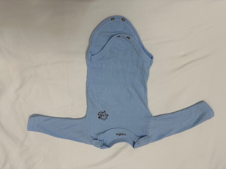 Pastel mavi renkte, uzun kollu ve boğazlı bebek body. Yumuşak ve sıcak kumaştan, düğmeli ve küçük nakış detaylı. Birkaç kez kullanıldı deformesi yoktur